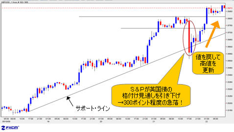 赤い円で囲まれた部分に見られる英ポンドの急落は、格付機関大手スタンダード・アンド・プアーズ(S&P)がこの日、英国の格付け見通しを「安定的」から「ネガティブ」へ引き下げたことに起因している。