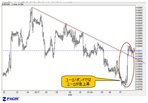 もっとも、昨日の英ポンドの反落は、ユーロ/英ポンドの急伸につられた側面が強く、ドルの軟調が一層露呈したとさえ見て取れる。ユーロ/英ポンドの1時間足を見ると、一目瞭然だ。