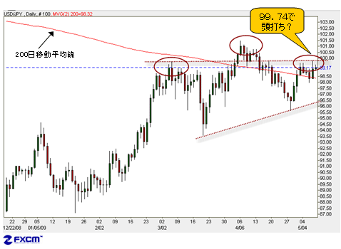 ドル/円の日足を見ると、昨日の急伸によって再び200日移動平均線のサポートを確認した。これは、強いシグナルであるはずだ。しかし、気になるのは昨日の「上ひげ」の出現によって、99.74円での頭打ちを示唆していることだ。