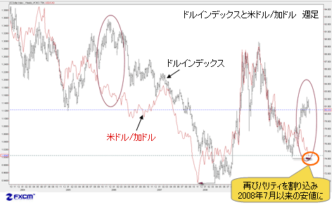 従って、この先は、米ドル/加ドルが底打ちしてドルインデックスの方向に追随してくるというよりも、ドルインデックスが米ドル/加ドルの方向に追随してくる可能性が高い。