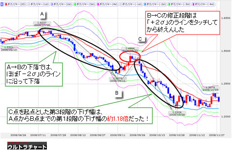 チャートにはボリンジャーバンドのバンドが8本引かれているが、ご覧のとおり、A→Bの第1段階の下落では、ほぼ「−2σ」のラインに沿って下落していた。