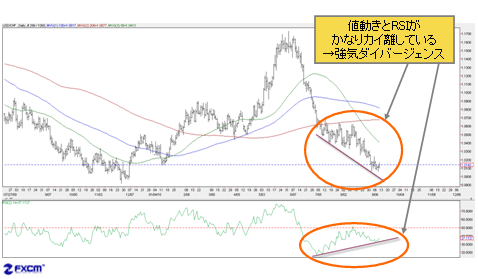上に示したのは米ドル/スイスフランの日足チャートだが、7月以降、値動きとRSIの傾向がかなりカイ離し続けている。
