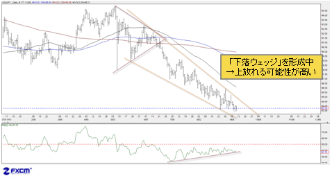 下に示した米ドル/円の日足チャートを見ると、5月中旬以降の値動きが大きな「下落ウェッジ(保ち合い)」を形成していることがわかる。