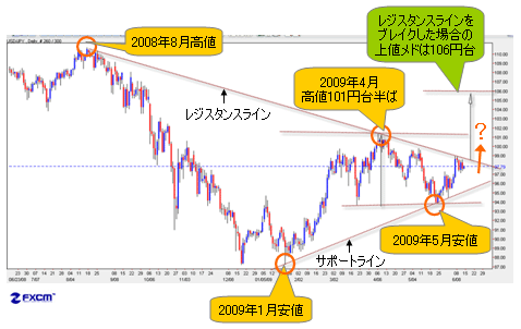上のチャートが示すように、2008年8月の高値から引かれたレジスタンスラインを上抜ければ、2009年1月につけた年初来安値から引かれたサポートラインとともに形成された「トライアングル(三角保ち合い)」を上放れることになる。