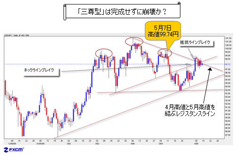 それは、「三尊型」の別名である「ヘッド&ショルダーズ」の「肩」の部分をブレイクすることが条件となる。具体的には、5月7日の高値99.74円を上抜けることだ。