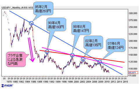 「高値と高値を結ぶレジスタンス・ラインを引いてみましょう。プラザ合意のところに断層ができていて、プラザ合意前とプラザ合意後では相場が違うという見方もあります。