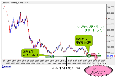 「1995年の79.75円。これが変動相場制以降の米ドル/円最安値ですね。そこから、昨年、2009年11月の84.80円に向けて、少しだけ右肩上がりのサポート・ラインを引くことができます」
