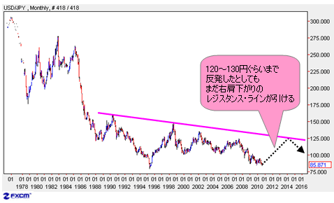 ただ、いろいろレジスタンス・ラインは引けるんだけれども、すべて右肩下がりであることに変わりはありません。主要な高値が年々切り下がってきていますからね。つまり、大きな流れは一貫して米ドル安・円高。これが一番重要なことなのです」