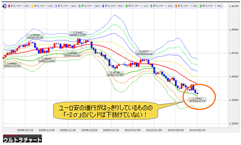 上のチャートを見ると一目瞭然だが、ユーロ/米ドルの日足チャートを「ボリンジャーバンド」で見ると、足元でユーロ安の進行がはっきりしているにも関わらず、「−2σ」のバンドを超えて米ドル高が進むことはなかった。