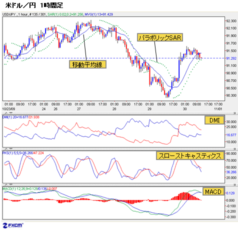 上の例では、もっとも基本的な移動平均線とローソク足のみで鈴木さんに説明してもらったが、相場の方向性を見る場合、鈴木さんがよく使っていて、オススメのテクニカル指標は、移動平均線の他にパラボリックSAR、DMIあたりだという。