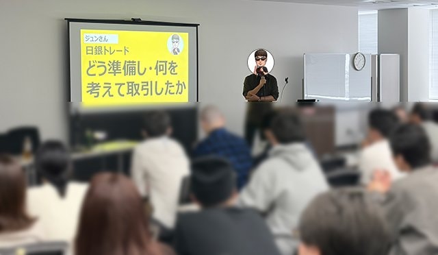 これまでのジュンさんの講演内容は相場に対する心構えや、勝てるトレーダーになるために必要なメンタルといったテーマが中心だったが、今回は初めてより実践的な内容を披露してくれた。セミナーテーマは「日銀トレード どう準備し・何を考えて取引したか」だ。