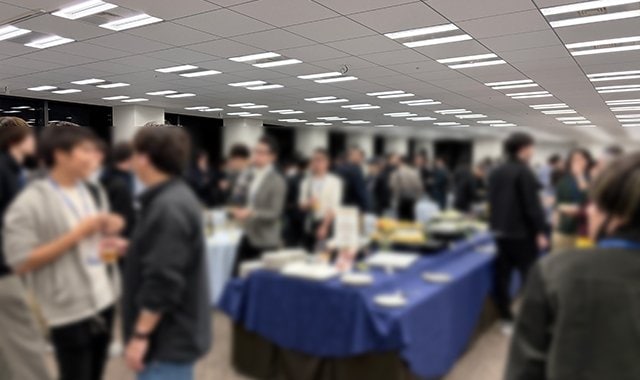 会場に用意された飲み物や食事を片手に、思い思いに交流を深める参加者。講師やスキャルピング界隈で著名なトレーダーの周りには、直接質問するために何人もの参加者が順番待ちの列を作る様子も
