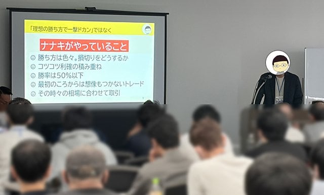 どんなに大きな資産を築いたトレーダーであっても100戦100勝のトレードは不可能で、磨き上げてきた手法が通用しないタイミングは必ず訪れる。はんさんの講義は、日々の地道な努力の積み重ね、そしてトレードの振り返りとブラッシュアップの繰り返しこそが、成功への唯一の道だと感じさせてくれた。