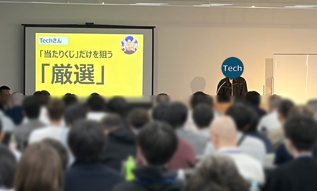 うまくいっているトレーダーから「聞いたことやアドバイスされたことは素直にやってみる」実行力が大事! というナナキさんのセミナーの余韻が残るなか、この日最後の講師として登壇したのが「Techさん」。2023年12月にFXの勉強を始め、2カ月後にスキャルピングで取引を開始すると、その年のうちに累計収益が1億円を超えた超実力派のトレーダーだ。