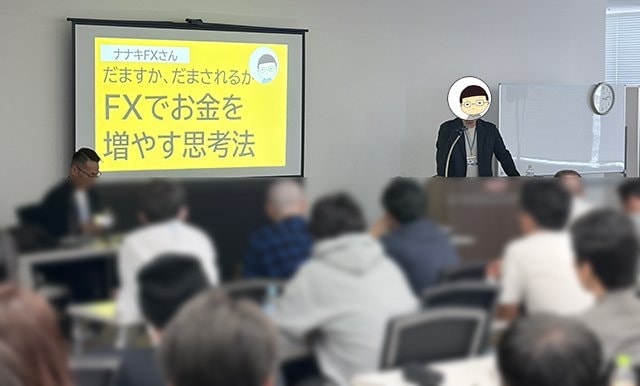 FXで勝ち始めてから44カ月(セミナー時点)で、月間でマイナスの収支となったのはたった2カ月だけという安定感を誇るナナキさんのテーマは、「だますか、だまされるか FXでお金を増やす思考法」だ。